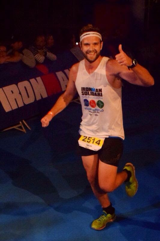 Esperamos. No le vemos llegar. Ha tenido que hacer los últimos km,s a casi 6'30" el km. ¡Sufrimiento! Pasan unos minutos y pienso en una lesión o que los problemas gástricos hayan ido a peor...¡Ya llega! No bajaremos de las 11 horas -¡a pesar de que es un reto solidario pensamos en ello, también! La feina ben feta! Levanta los brazos, se gira hacia el público en las gradas y saluda. ¡Hay que disfrutar del momento! Carlos y yo nos abalanzamos hacia él y nos abrazamos. Es tremenda la alegría de Marc. Nos contagia. ¡Haríamos otro Ironman en ese momento!