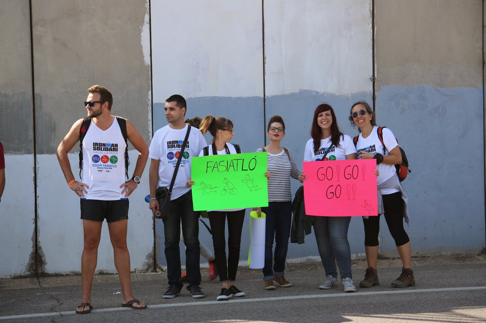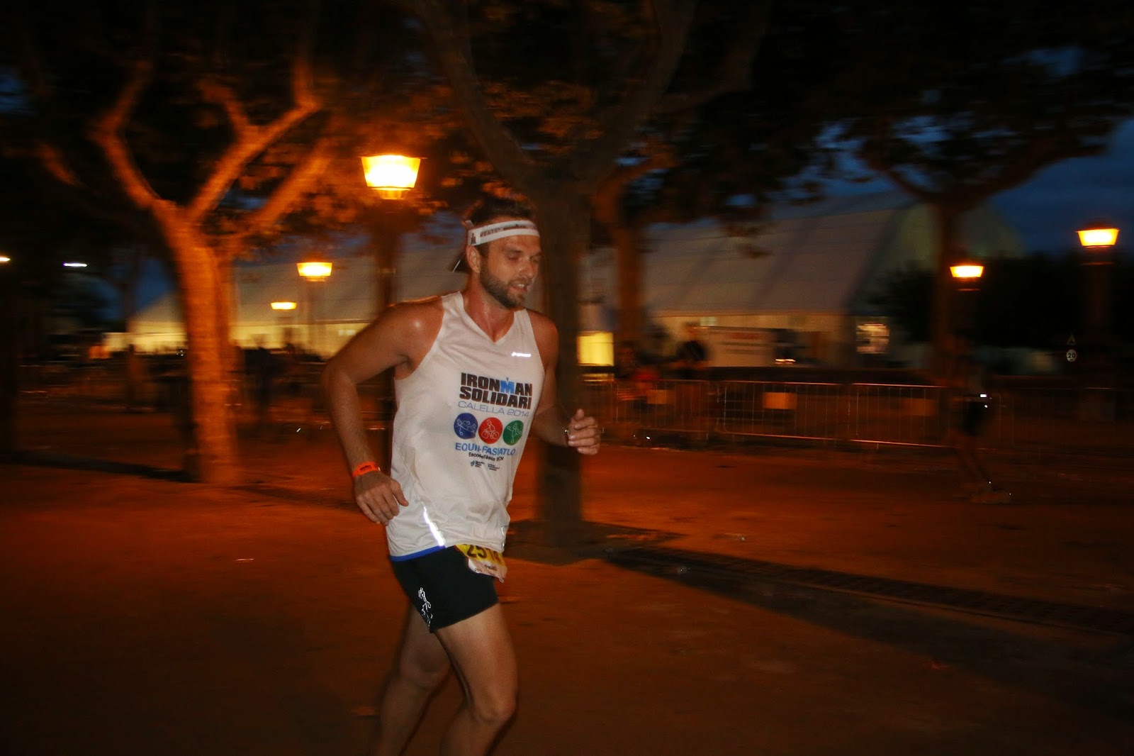 Le vemos en el primer paso cerca de la carpa de bicis. Va volando y adelantando a muchos corredores. Tiene un aspecto fenomenal y lleva buen ritmo. Si sigue así, ¡igual bajamos de las 11 horas!. Su padre le sigue haciendo fotos en cada paso por los diferentes puntos de la carrera. Hay maratonianos que ya no pueden más y se desplazan, incluso, caminando. Triatletas mareados, cansados, pero intentando completar su reto, su desafío, su objetivo. Veo, al igual que en el sector de bici, muchas camisetas de participantes por un reto solidario, entre ellos la Associació Aprenem que aglutina niños con autismo; otros por el ELA, discapacitados de otras comunidades del país o extranjeros. ¡Todos tienen su motivo para hacer un Ironman! Me despido de los padres que han venido a animarme. Hay que irse, que es domingo y los niños deben preparar las cosas para la escuela. Esa Escola Fàsia que tanto les ayuda, comprende y les acoge como personas. Aunque un poco, y gracias a muchas personas con sensibilidad hacia lo ajeno, debemos estar agradecidos a que existan escuelas de educación especial para nuestros niños especiales. ¡Y que no decaigan en ello ni los profesionales ni los padres implicados!